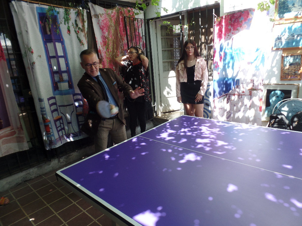 juego paleteando con el Padre Ignatio, atrás observan Angely Jaramís y