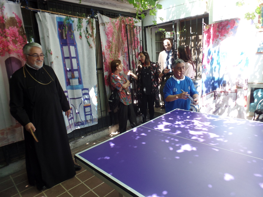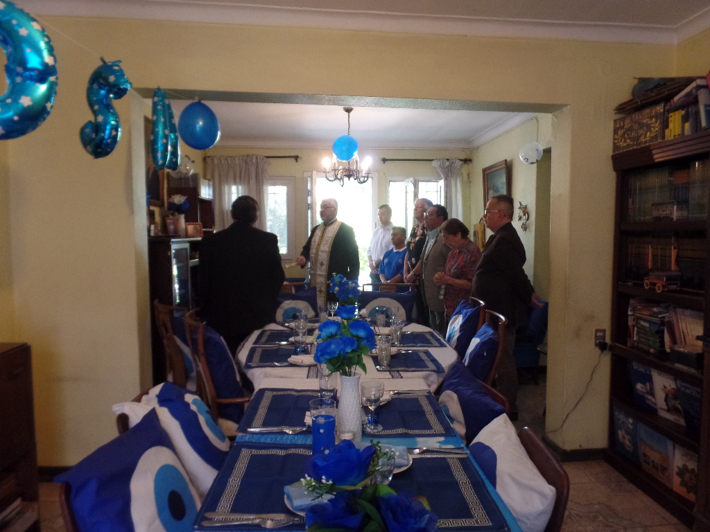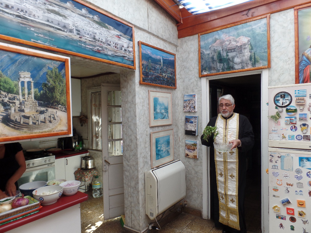 Padre Ignatio bendiciendo el sector de la cocina ambientado con cuadros de