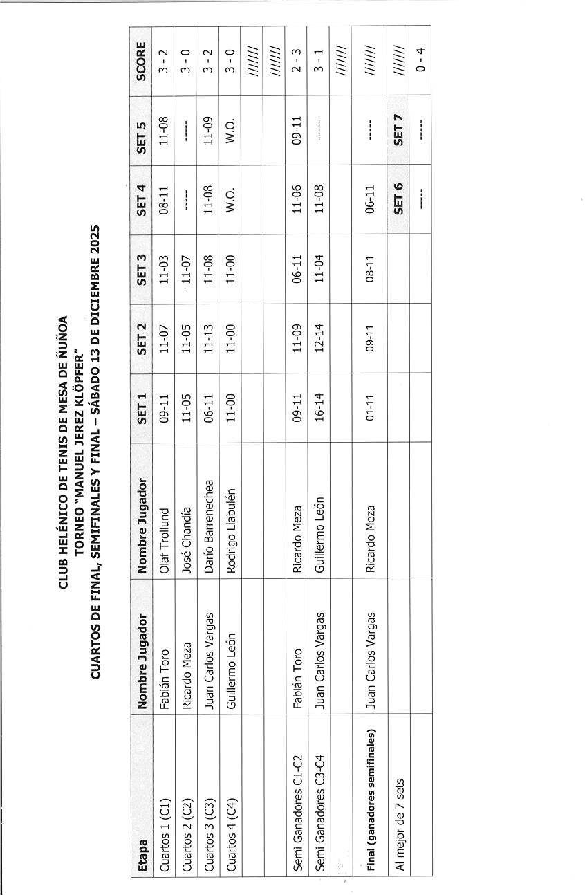 CUARTOS DE FINAL: SÁBADO 13 DE DICIEMBRE 2025 A LAS 16:15 HORAS EN AV. ELIECER PARADA 975 ÑUÑOA, (1) Fabián Toro VS. Olaf Trollund; (2) Ricardo Meza VS. José Chandía; (3) Juan Carlos Vargas VS. Darío Barrenechea y (4) Guillermo León VS. Héctor Llabulén